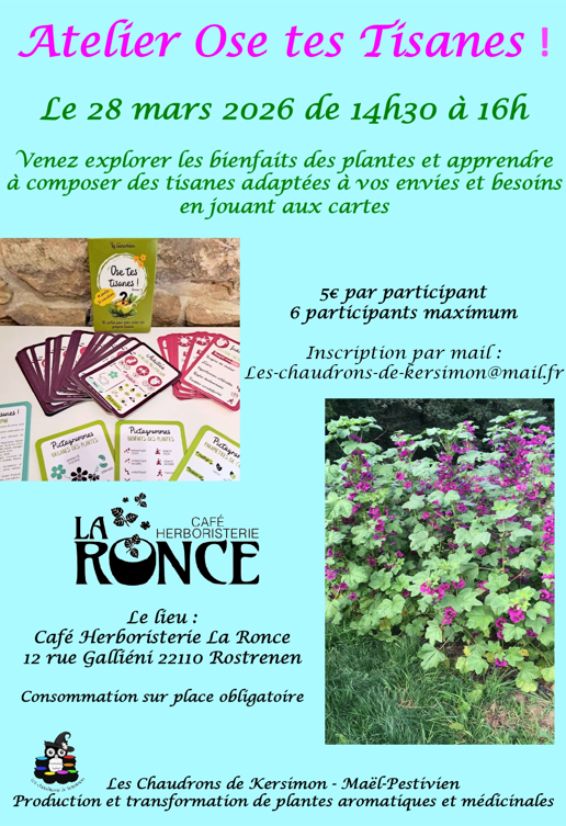 Agenda Explorez le programme complet des évènements à venir : Samedi 4 avril – Atelier créatif « Créer sa poupée gardienne » avec Audrey Duez, art-thérapeute Samedi 28 mars à 14h30 – Atelier « Ose tes Tisanes » avec Chloé Gambard des Chaudrons de Kersimon Vendredi 20 mars à 18h – Solo guitare, musique improvisée avec Clément Bertine